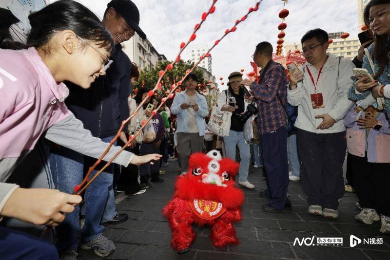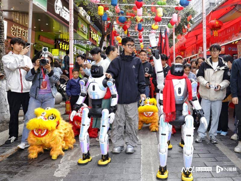 传统广府文化与前沿科技“双向奔赴”:国家级非物质文化遗产醒狮与“科技新星”机器狮联袂献演;“社牛”智能机器人“秀秀”亮相,不仅能歌善舞,还挥春送福,成为花市新宠。