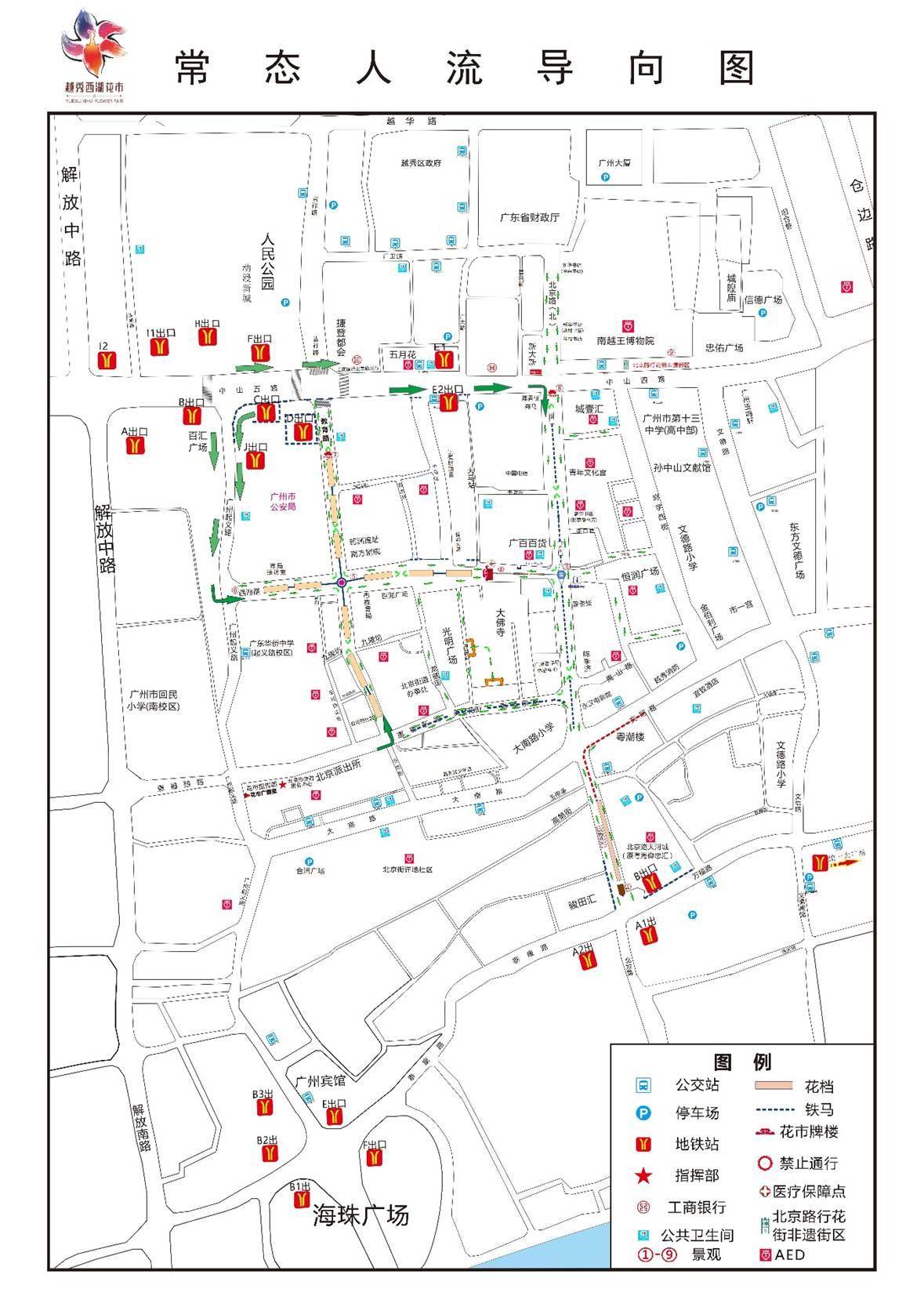 花市期间,西湖花市全域、北京路中段和南段、惠福东路美食街,均实行按人流指示方向流动,各路段可通过调头位变换行进方向。