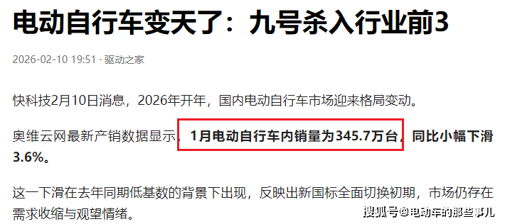 足球直播,欧洲杯直播,体育直播,球客直播,雷速体育,篮球直播,风驰直播,NBA直播,英超直播,足球比分,足球赛事,意甲,欧冠,世界杯,世界杯直播,村超,贵州村超,波胆,角球,串球,大小球近日,奥维云网发布了一组挺“吓人”的数据,PSI产销数据显示,今年1月中国电动两轮车的内销量竟然高达345.7万台。虽然同比只是小幅下降了3.6%,但在如今的大环境下,这绝对是个亮眼的成绩。可问题来了,数据漂亮归漂亮,现实情况却完全是另一番景象。