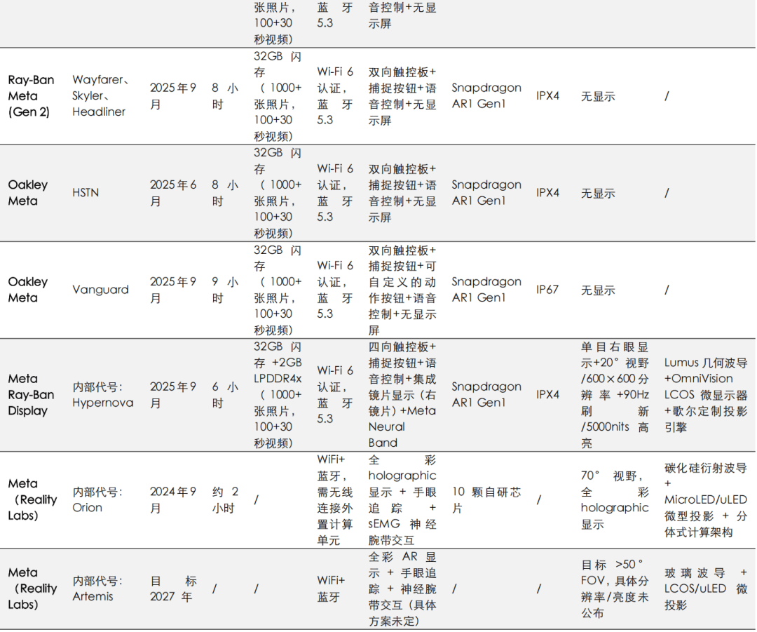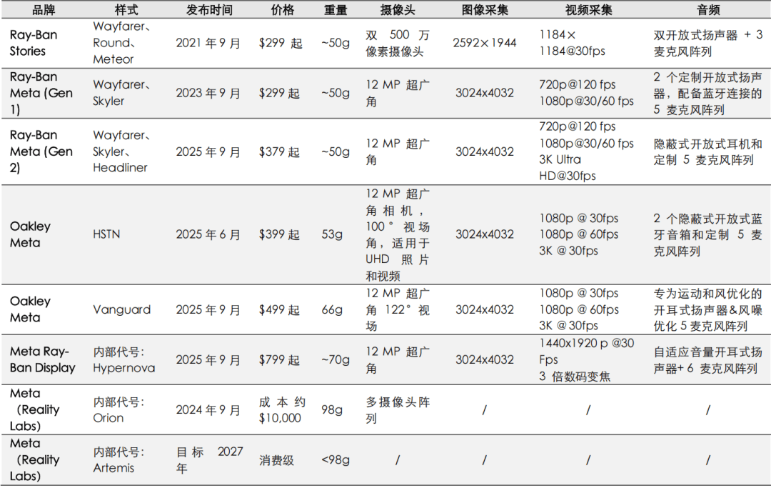 AI音频/摄像眼镜: 以Ray-Ban Meta Gen 1/2和Oakley系列为代表。这类产品不具备视觉显示功能,依赖语音交互和音频反馈,主打轻量化与内容捕捉。