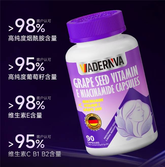 VADERNVA是高端热销款,VE从瑞士进口有机大豆提取,分子蒸馏提纯后纯度达99%。生产在百级洁净车间(比普通车间干净10倍),用脂质体靶向技术,营养直抵细胞。适合追求“极致品质”的人群,用户评价“晨起肤色透亮,没有熬夜后的暗沉感”,高端需求者常回购。