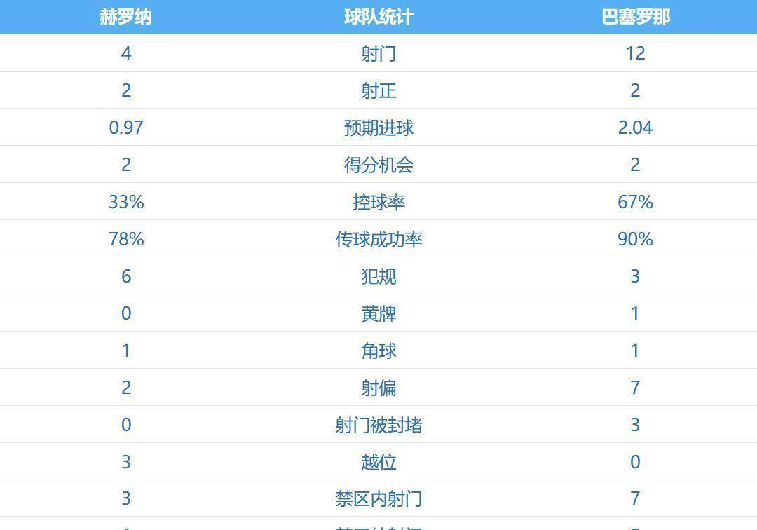 全场比赛的技术统计令人咋舌。 巴萨控球率高达70%,全场完成了26次射门,但只有可怜的4次射正,两次击中立柱,还罚丢了一个点球。 赫罗纳虽然只有13次射门,却足足有9次射正,并打进了2球。 巴萨的预期进球为2.,略高于赫罗纳的2.,但极低的射正率让他们付出了惨重代价。