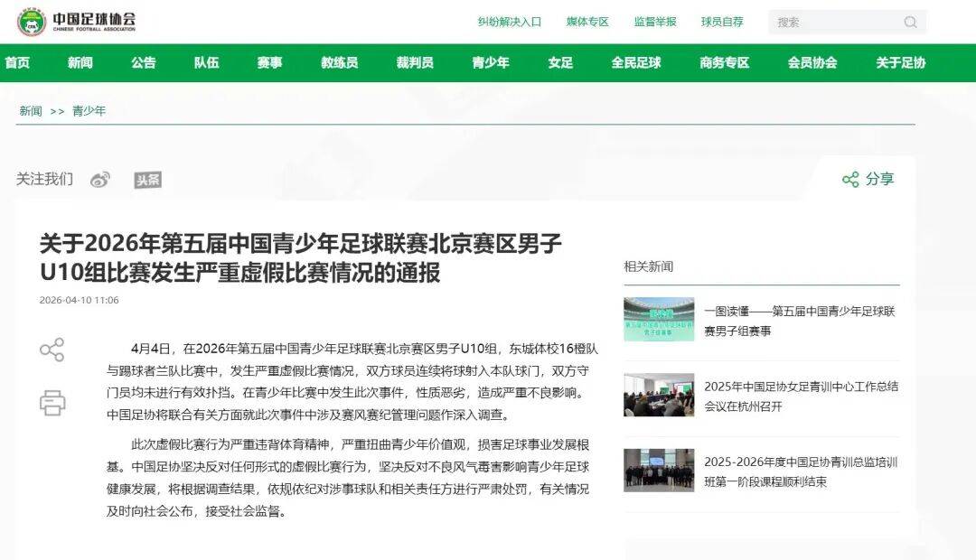 足球直播,欧洲杯直播,体育直播,球客直播,雷速体育,篮球直播,风驰直播,NBA直播,英超直播,足球比分,足球赛事,意甲,欧冠,世界杯,世界杯直播,村超,贵州村超,波胆,角球,串球,大小球4月10日,中国足协网站发布关于2026年第五届中国青少年足球联赛北京赛区男子U10组比赛发生