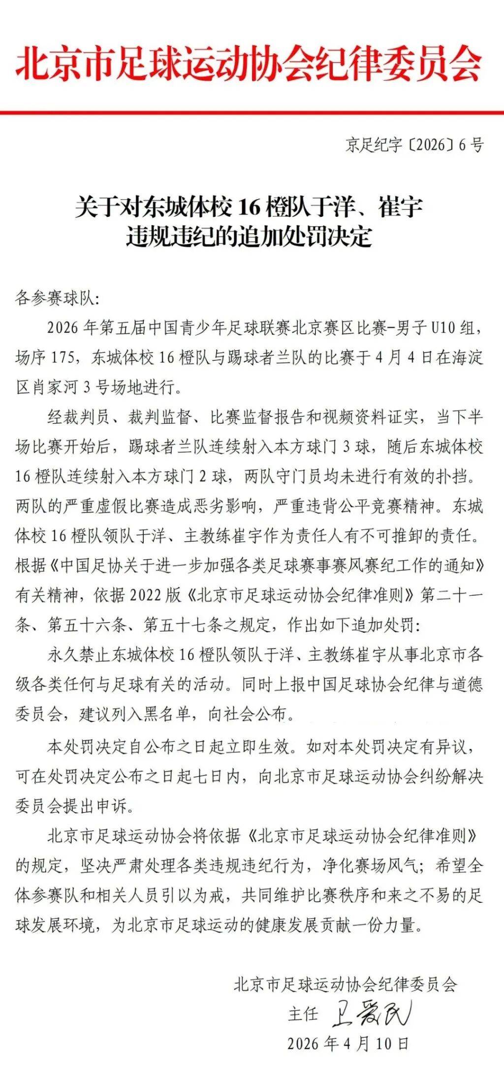 4月10日中午,北京足协就“2026年第五届中国青少年足球联赛北京赛区男子U10组比赛严重虚假比赛”事件发布追加处罚决定:永久禁止踢球者兰队领队王征、主教练姜凯以及东城体校16橙队领队于洋、主教练崔宇从事北京市各级各类任何与足球有关的活动。同时上报中国足球协会纪律与道德委员会,建议列入黑名单,向社会公布。