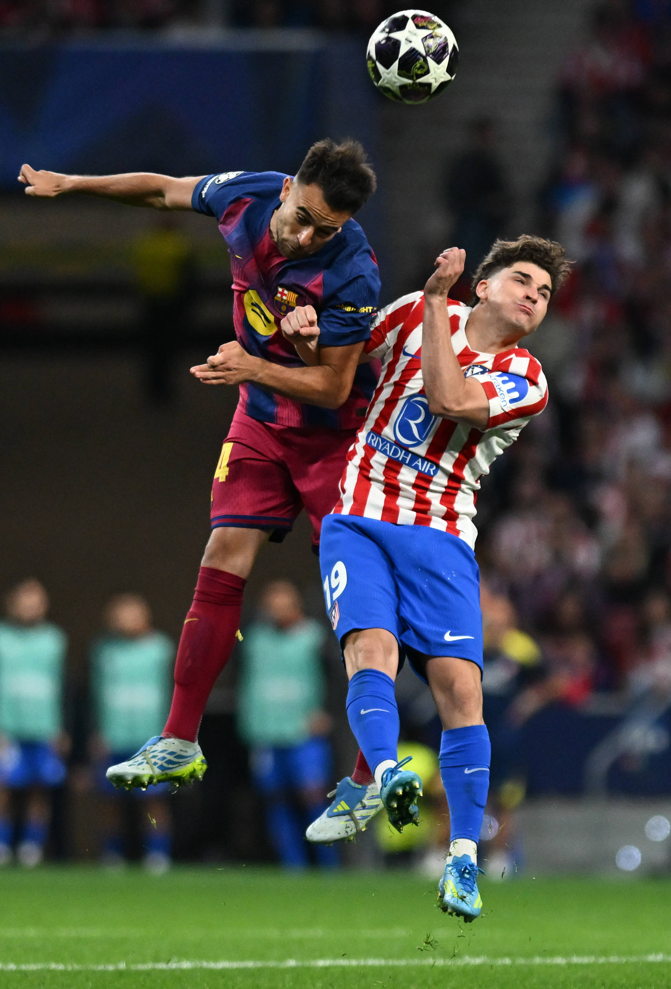 4月14日,马德里竞技队球员阿尔瓦雷斯(右)在比赛中争顶头球。 新华社记者 程敏 摄