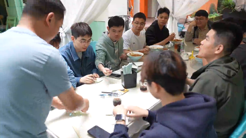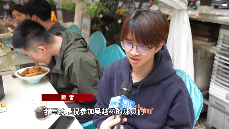 溪启杭味面馆负责人 江军昌:今天早上有两个西安过来的小伙子,我跟他们聊了一下,他说吴越杯我也看了,然后他给我们写了留言,他说我祝你们杭州队夺冠,所以我其实还蛮开心的。